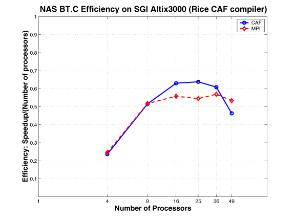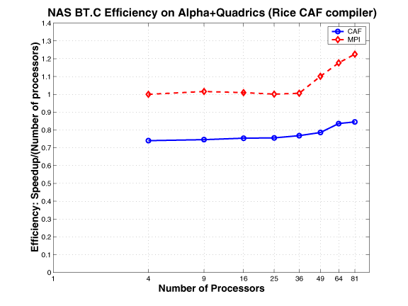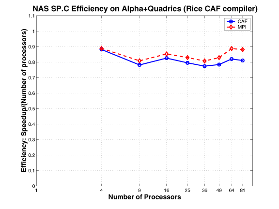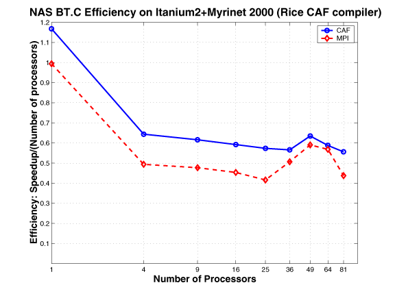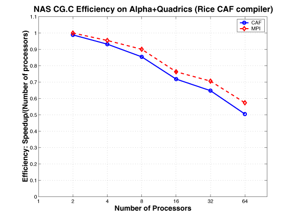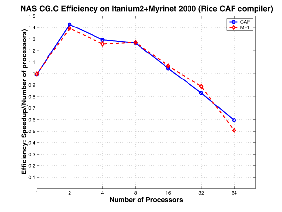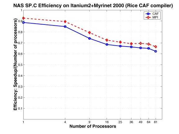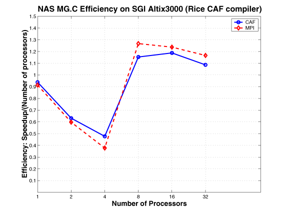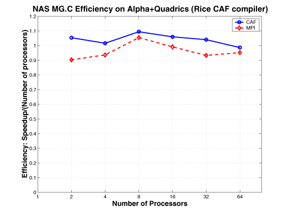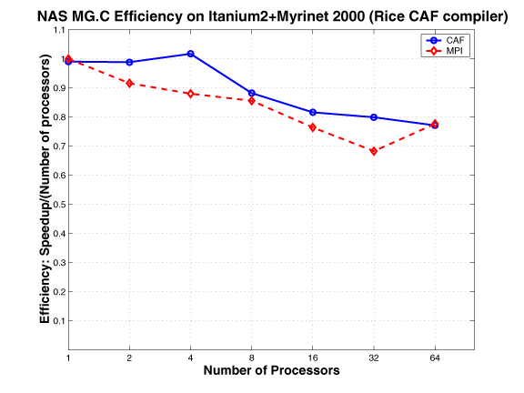 The CAF version of MG mimics the MPI version. The communication buffers used in the MPI version are replaced by co-arrays; the communication is expressed using CAF syntax, as opposed to using MPI primitives. This approach requires explicit synchronization.
