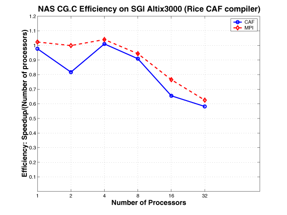 In the NAS CG parallel benchmark, a conjugate gradient method is used to compute an approximation to the smallest eigen value of a large, sparse, symmetric positive definite matrix. This kernel is typical of unstructured grid computations in that it tests irregular long distance communication and employs sparse matrix vector multiplication. The irregular communication requirement of this benchmark is evidently a challenge for all systems.